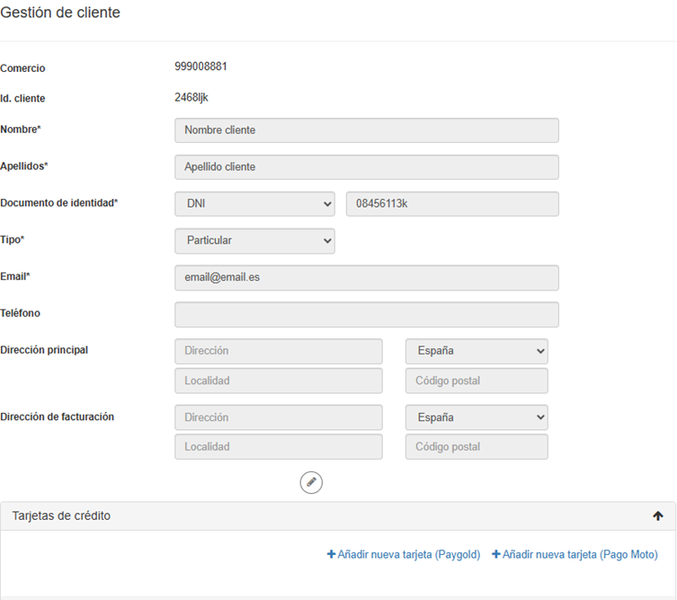 Dentro de la pantalla de edición de los datos del cliente, podrás también ver, agregar o eliminar los métodos de pago que tenga registrados. Ten en cuenta que nunca podrás revisar los detalles completos de las tarjetas del cliente.