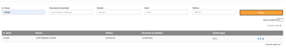 • Datos del cliente: No debes rellenar todos los datos de tu cliente, sino que esta sección actúa de buscador en tu cartera de clientes. Simplemente rellena algún dato identificativo y pulsa el botón buscar, para que se muestren los resultados de la búsqueda. Al seleccionar un cliente, deberás seleccionar también el método de pago, de entre los que tiene registrados, que se usará para realizar el cobro.