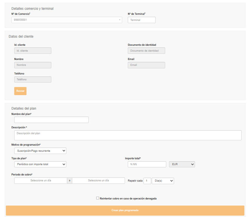 • Detalles del plan: En esta sección se configuran los detalles del plan de pagos que se aplicará al cliente, ya sea una suscripción o un pago aplazado. Podrás configurar que se reintente en caso de operación denegada y calcular cuotas si se trata de un pago aplazado.