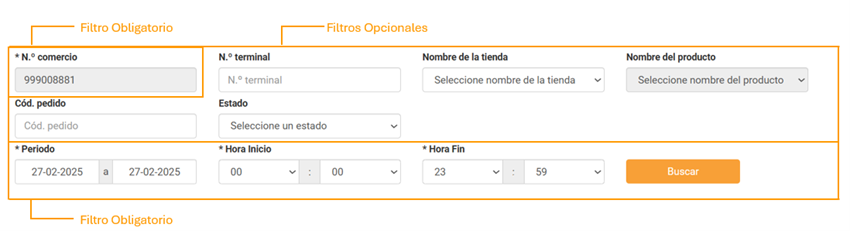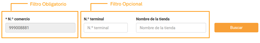 El número FUC del comercio es un parámetro obligatorio, mientras que el número de terminal o el nombre de la tienda son filtros opcionales que pueden utilizarse para afinar la búsqueda.