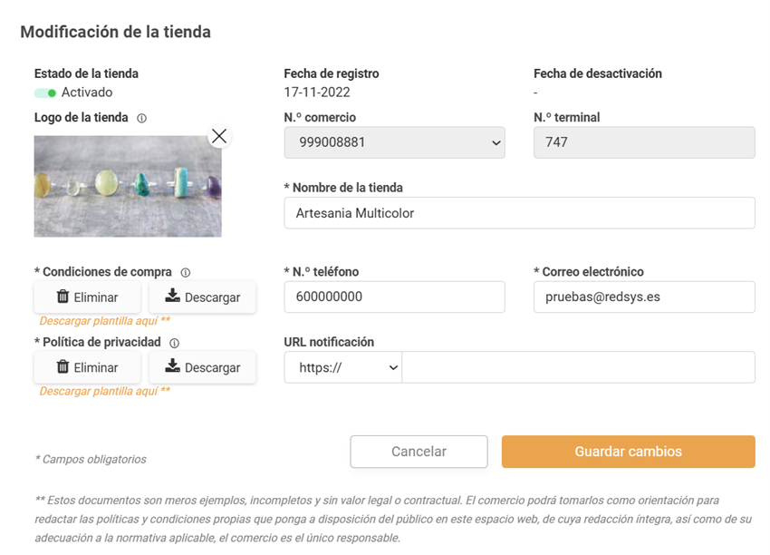No podrás cambiar algunos de los detalles como el número de comercio y terminal al que está asociada la tienda, pero podrás modificar el resto sin problemas. También podrás activar y desactivar la tienda a conveniencia si crees que no la vas a usar durante un tiempo o ya no la necesitas más.