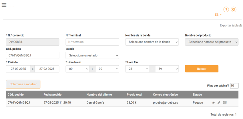En esta pantalla verás todos los pedidos que se hayan producido en el día de hoy, aunque podrás afinar la búsqueda mucho mejor utilizando los filtros superiores.