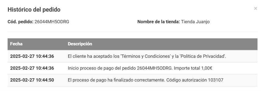 El tercer botón muestra el histórico del pedido, una linea temporal de todos los cambios realizados por el cliente y por ti como propietario sobre el pedido.