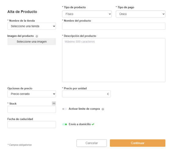 Debes rellenar todos los campos obligatorios. Subir una imagen del producto, establecer un límite de compra y poner una fecha de caducidad de la publicación del producto es opcional.