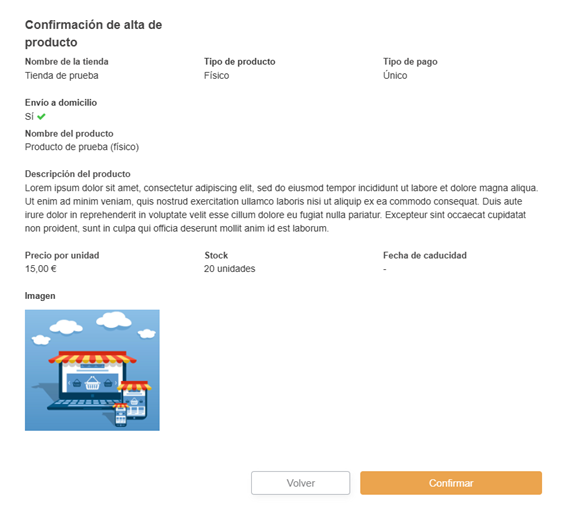 Al presionar el botón de continuar, se te mostrará un resumen de la configuración de tienda virtual que has establecido. Debes comprobar que todo es correcto y, una vez hecho, pulsar en confirmar.